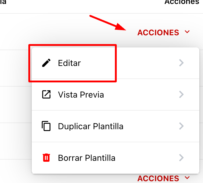 Para completar o editar el contenido de una plantilla, haz clic en Acciones - Editar.