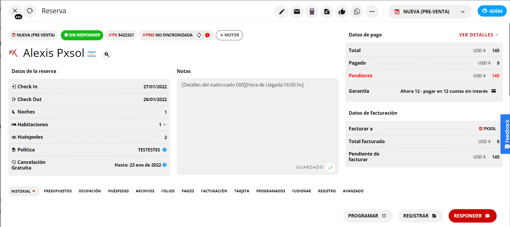 Ventana de detalles de la reserva.