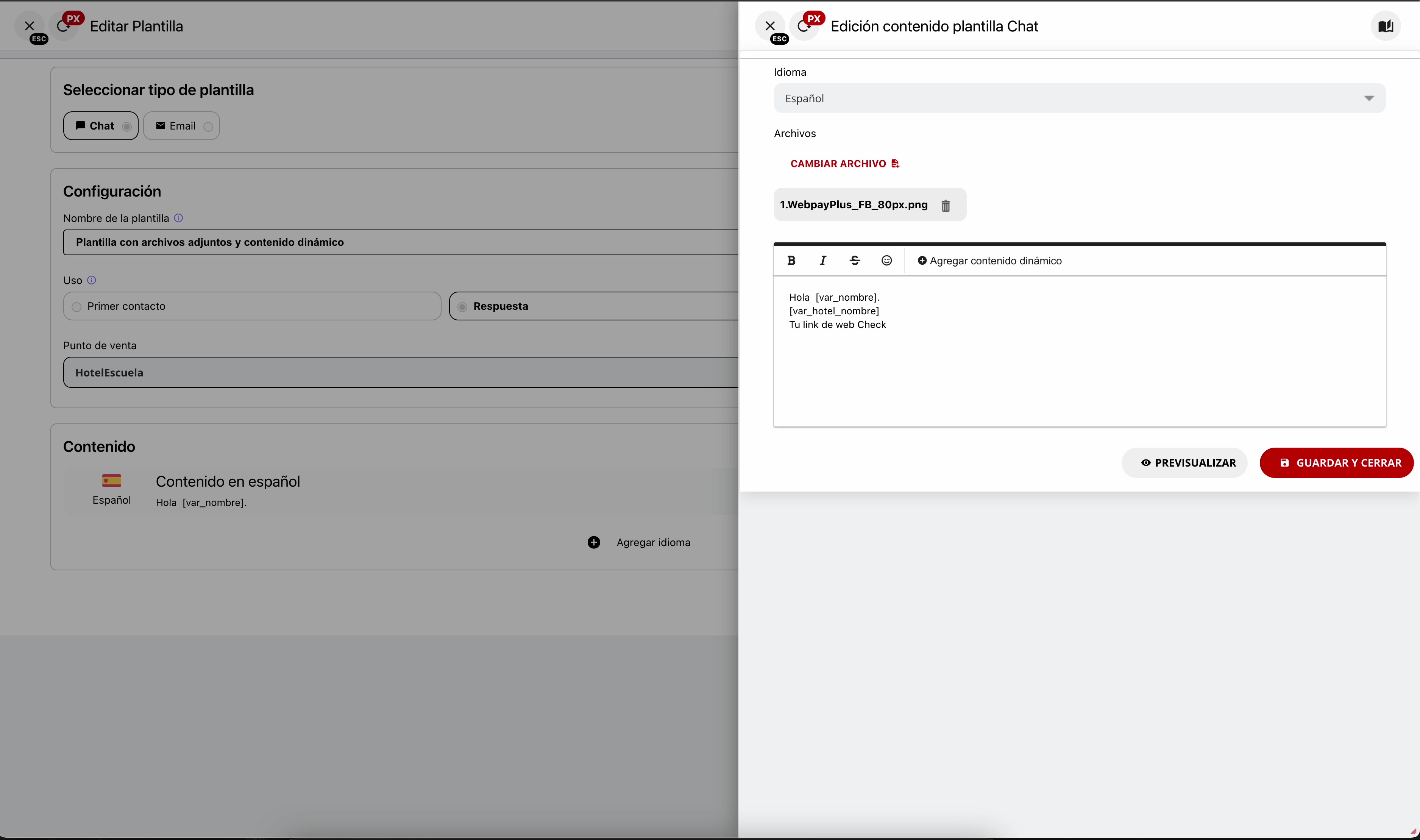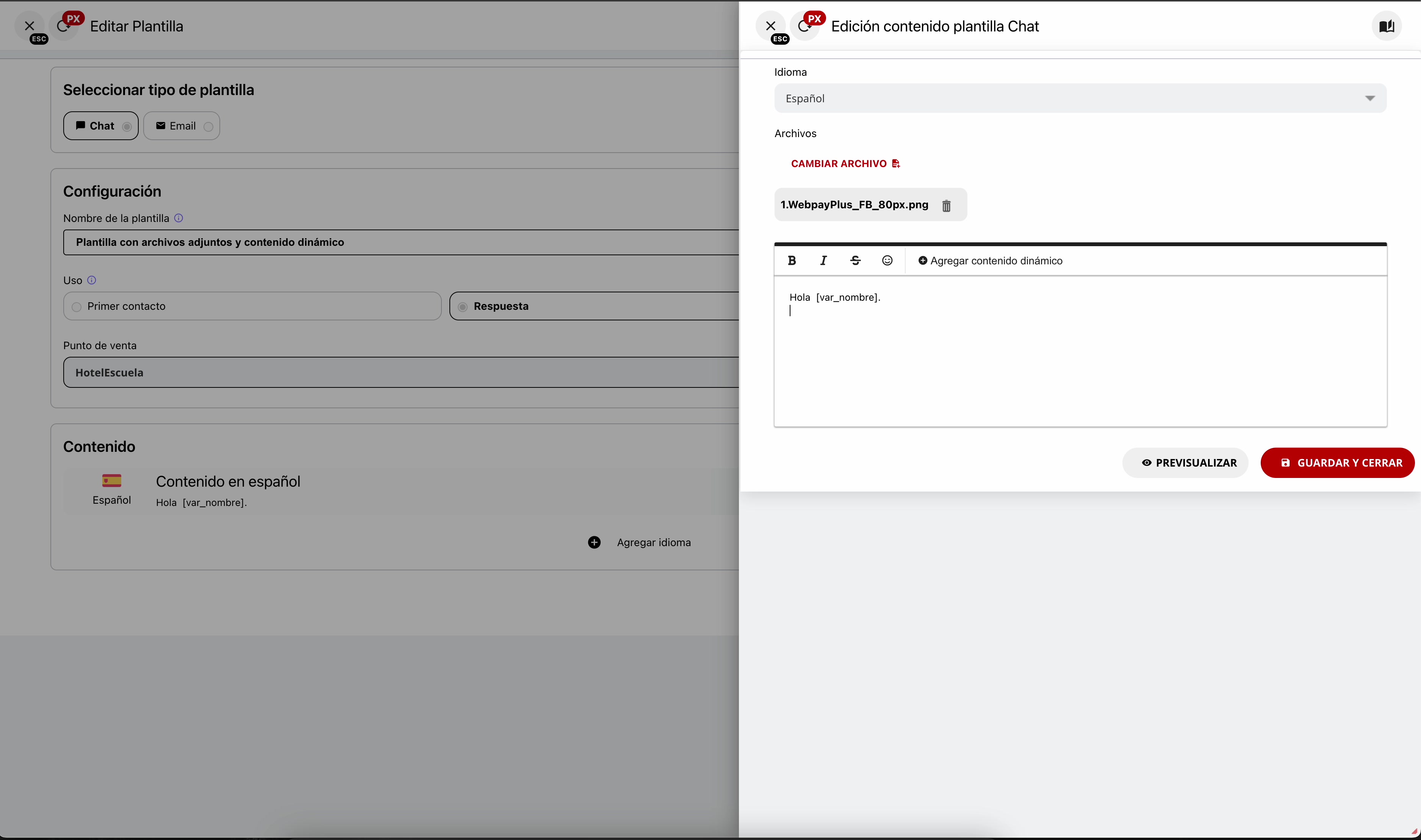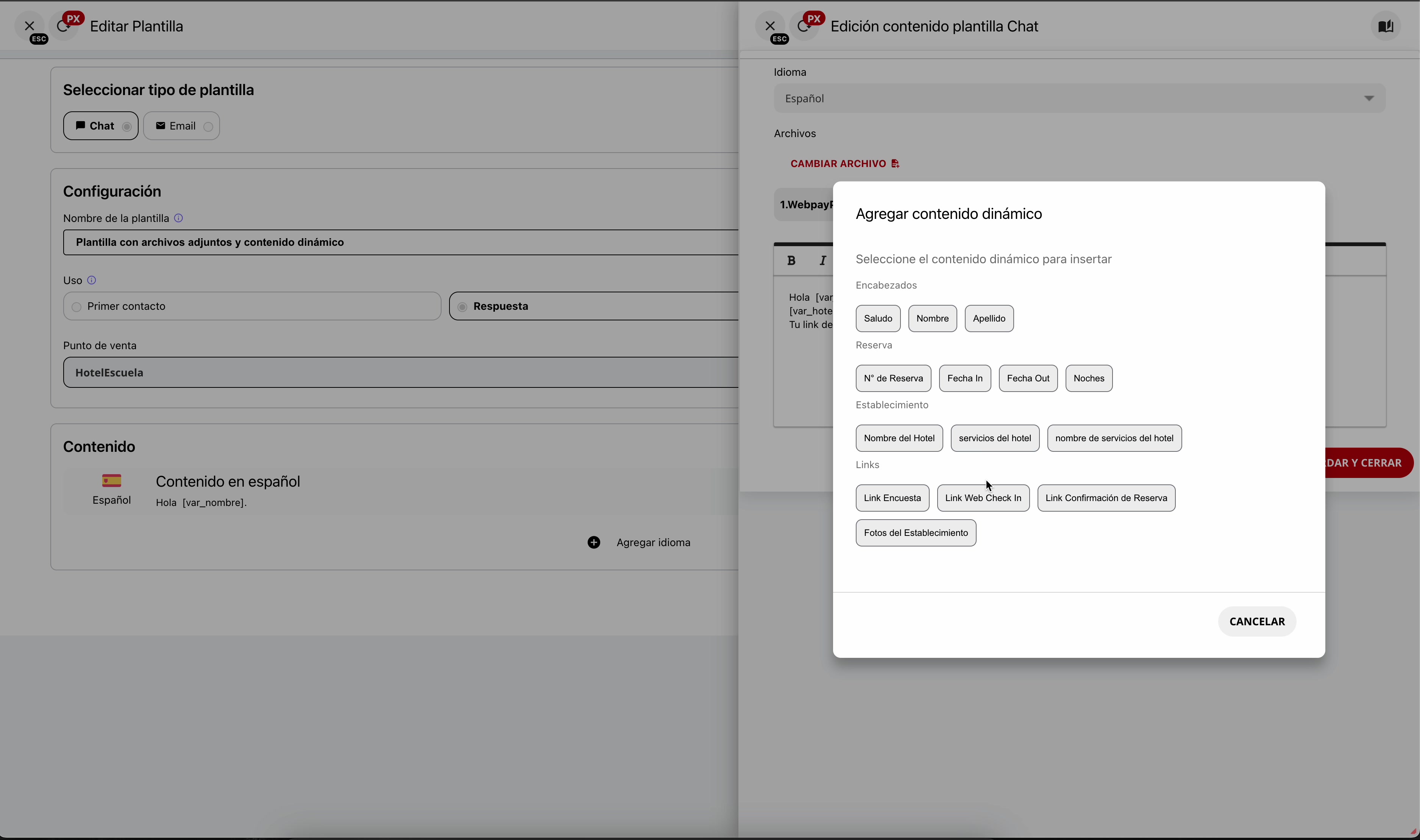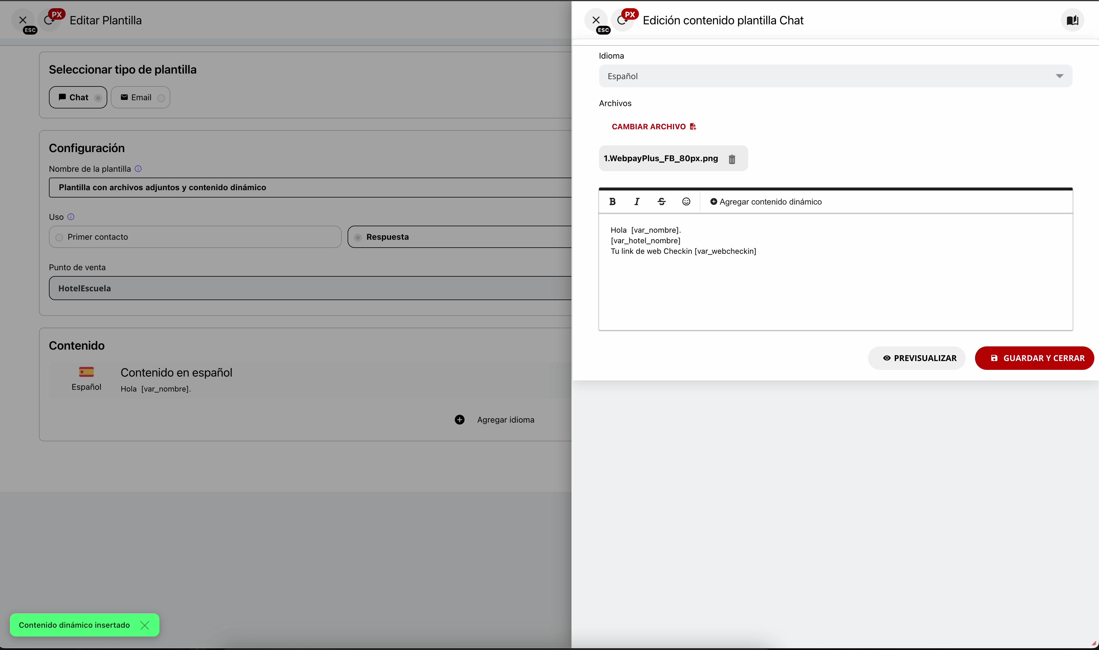 Dentro de la ventana “Edición contenido plantilla Chat”, sitúa el cursor en la posición del texto donde deseas añadir la información dinámica. A continuación, haz clic en el botón ”+ Agregar contenido dinámico” para abrir un selector de variables disponibles. Este botón se encuentra sobre el área de texto.