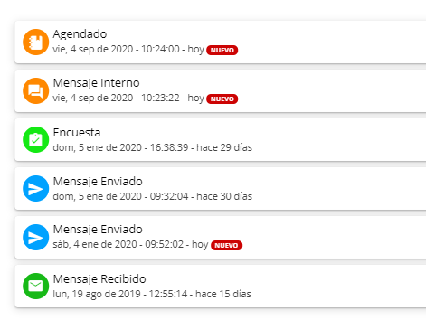 Ejemplo de la pestaña Historial con diferentes tipos de registros