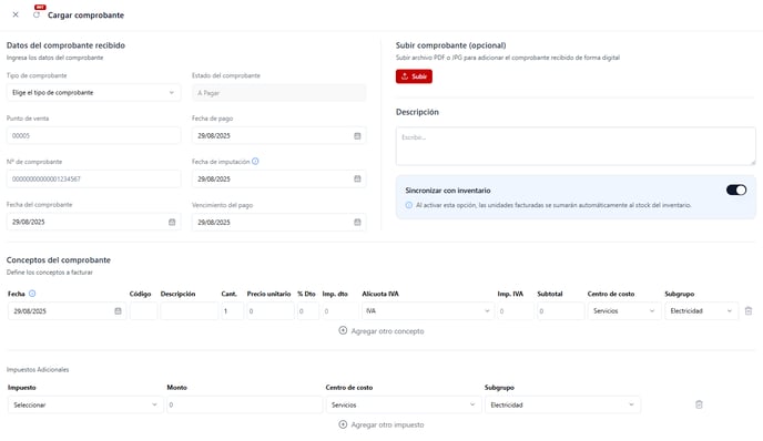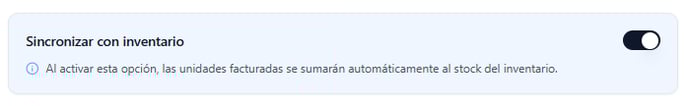 4.3 - Conceptos del comprobante: Seleccionar si desean que el inventario se cargue automáticamente al STOCK de la aplicación Inventario. Si desean que sume automáticamente dejar encendido. Sino, apagar el switch