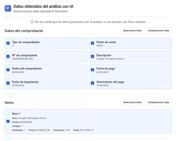 4.1.4- Una vez subido el comprobante se podrán seleccionar todos los parámetros que la IA ha detectado y que puede cargar automáticamente. Deseleccionar en caso de  que algún parámetro no se necesite cargar o modificar.