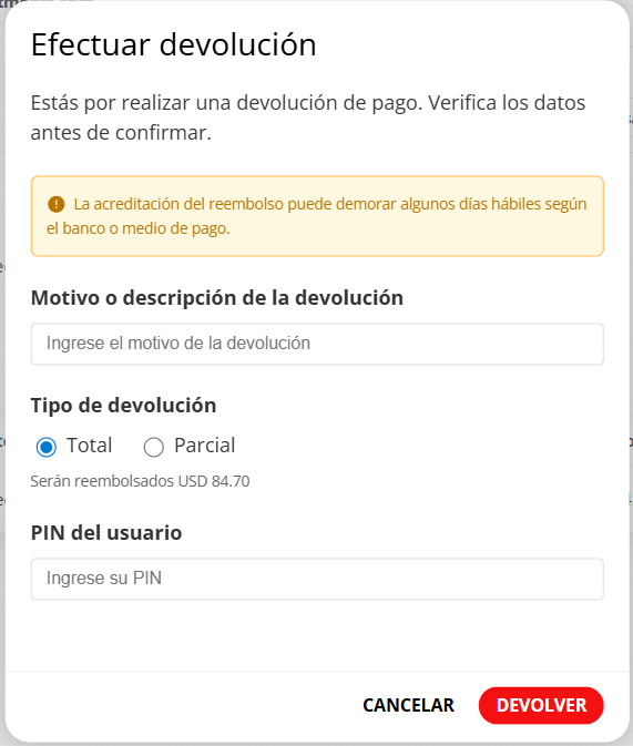 - Parcial: Se habilitará un campo adicional para que indiques el monto que deseas devolver.