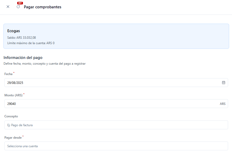 Pagar desde: Seleccionar la cuenta contable en la que debe contabilizar el pago