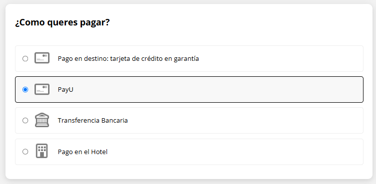 Una vez que el método de pago asociado a la pasarela está completamente configurado y activo, estará visible como una opción durante el proceso de check-out en el motor de reservas.