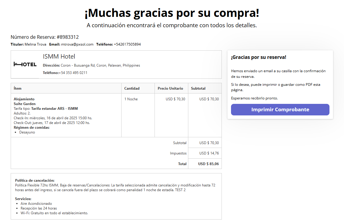 - Pago Exitoso: Se mostrará la reserva confirmada y el mensaje "Muchas gracias por su compra”. Link ejemplo: https://thegrandbudatest.hoteldemo.com.ar/neo_checkout/gracias.php?CID=8750306