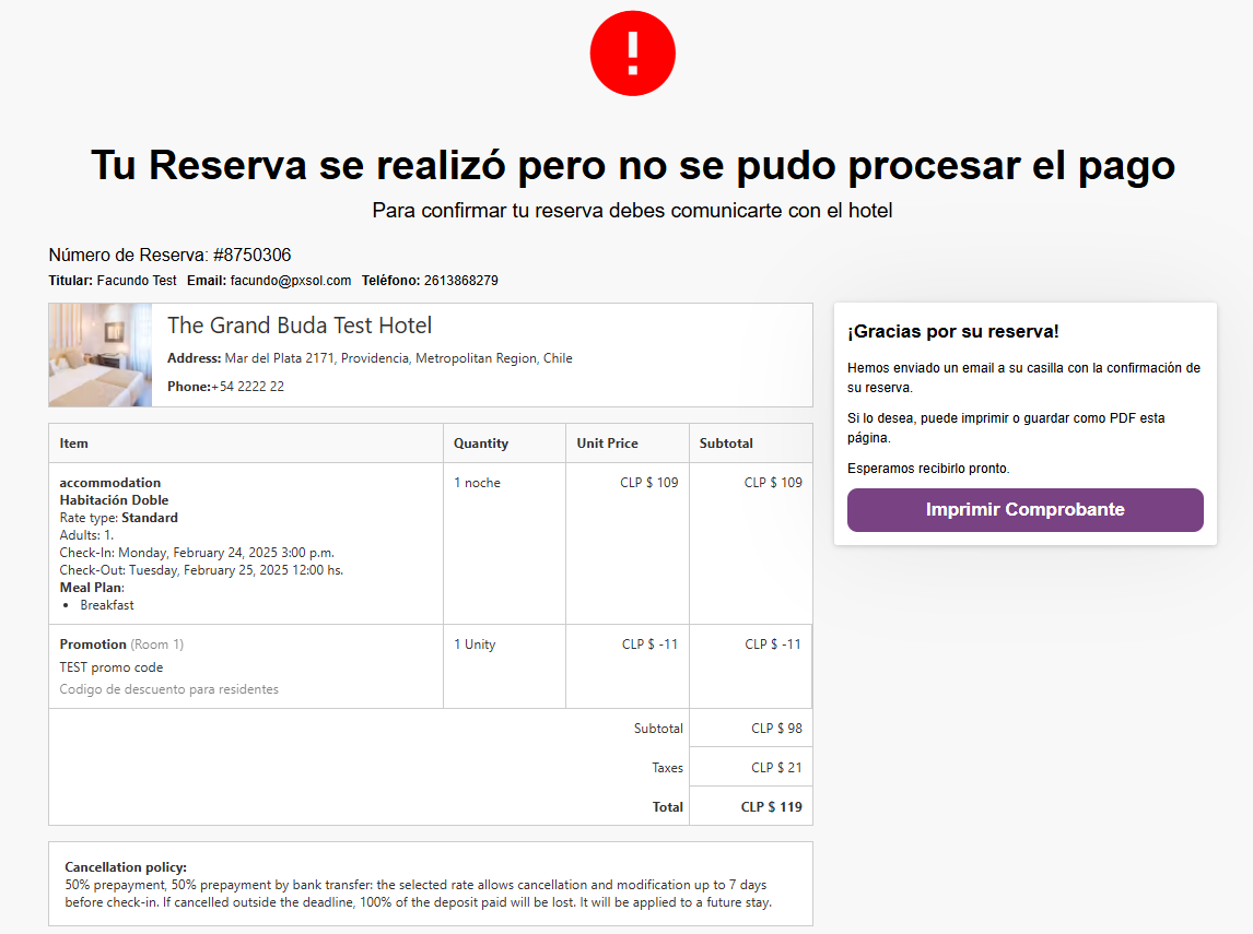 - Pago Rechazado: Se mostrará el mismo presupuesto pero indicando el error en el pago y solicitando comunicarse con el hotel. Link ejemplo: https://thegrandbudatest.hoteldemo.com.ar/neo_checkout/gracias.php?CID=8750306&error=error