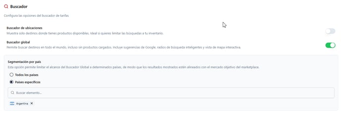 Buscador global: permite buscar destinos en todo el mundo, incluso en lugares donde no tengas productos cargados. Ofrece sugerencias de Google, radios de búsqueda inteligentes y una vista de mapa interactiva. Además, puedes filtrar por país en caso de no querer trabajar con todos los destinos.