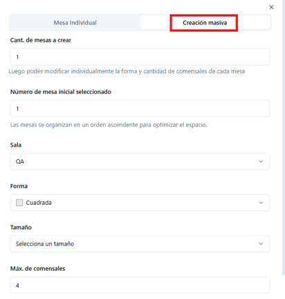 Dentro del salón, seleccioná “Crear mesa”. Puedo crear mesas de manera individual o masiva.