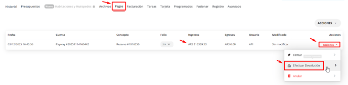 3. Sobre el pago ya acreditado, hacer clic en “Acciones” y elegir “Efectuar devolución”