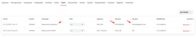 Una vez confirmada, el sistema generará, una nueva línea en movimientos de pago con el importe devuelto y el detalle del usuario que realizó la devolución.