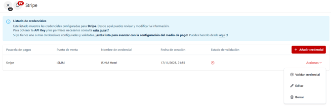 - Importante: El eliminar una credencial solo será posible si no está asociada a ningún medio de pago.