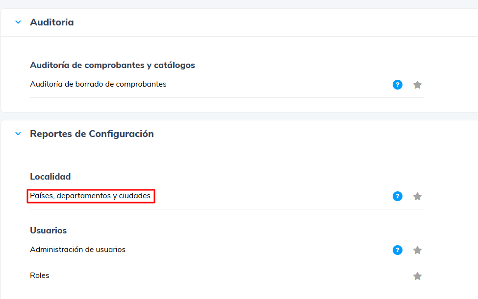 Desplácese hasta la sección de Reportes de Configuración y haga clic en Países, departamentos y ciudades.