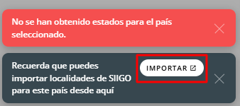 Si al intentar facturar se muestra una alerta indicando que un país, ciudad o estado no ha sido importado desde SIIGO, deberá cargar dicho país, estado o ciudad en SIIGO y luego importarlo nuevamente en Pxsol.