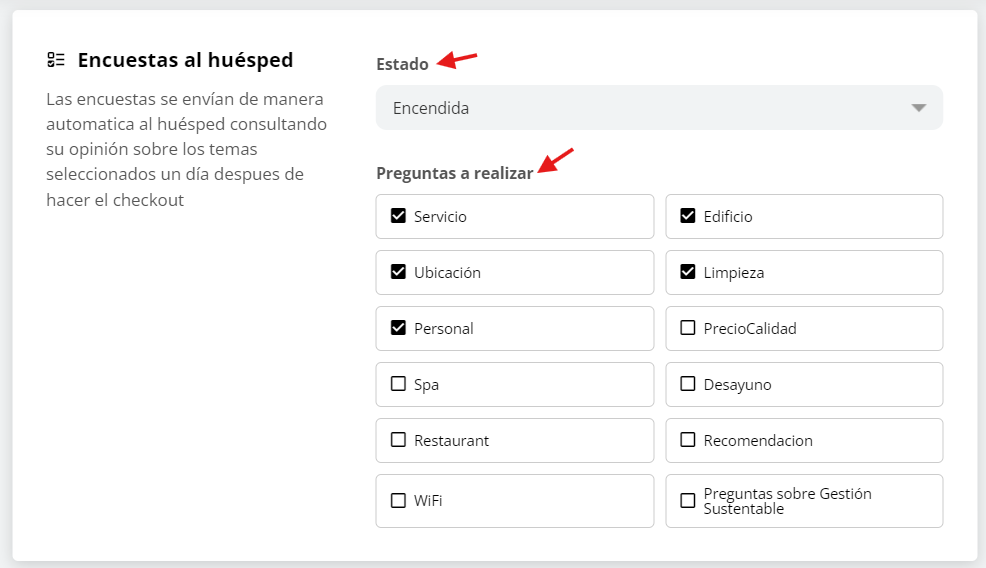 - Estado: Selecciona entre “Encendida” o “Apagada”. Si eliges “Encendida”, el sistema enviará automáticamente las encuestas a los clientes después de su check-out.