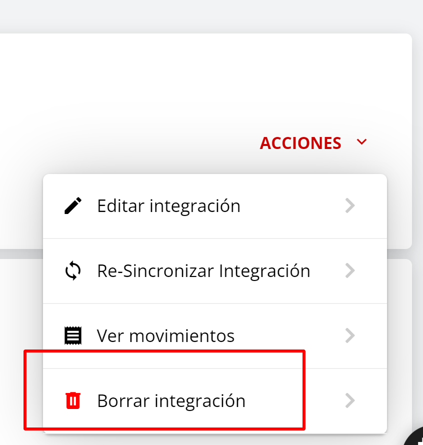 Si deseas borrar la vinculación de forma permanente, deberás utilizar la opción “Borrar integración” en el menú de acciones de la derecha.