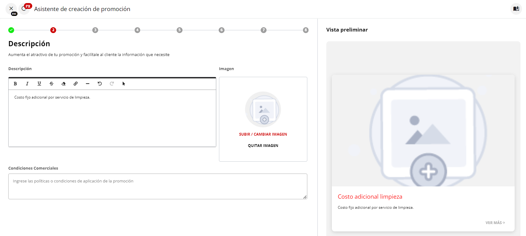 En la sección “Promociones”, selecciona el botón “Nueva Promoción” ubicado en la esquina superior derecha. Captura de pantalla mostrando el botón "Nueva Promoción" Esto iniciará un asistente que te guiará paso a paso para crear el cargo fijo adicional.