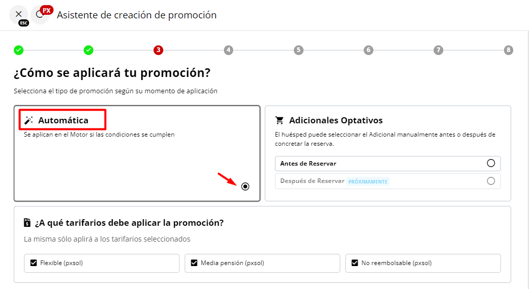 1. Selecciona el tipo de promoción: “Automática”. Esto asegura que el cargo adicional se muestre en el motor de reservas cumpliendo las condiciones establecidas.