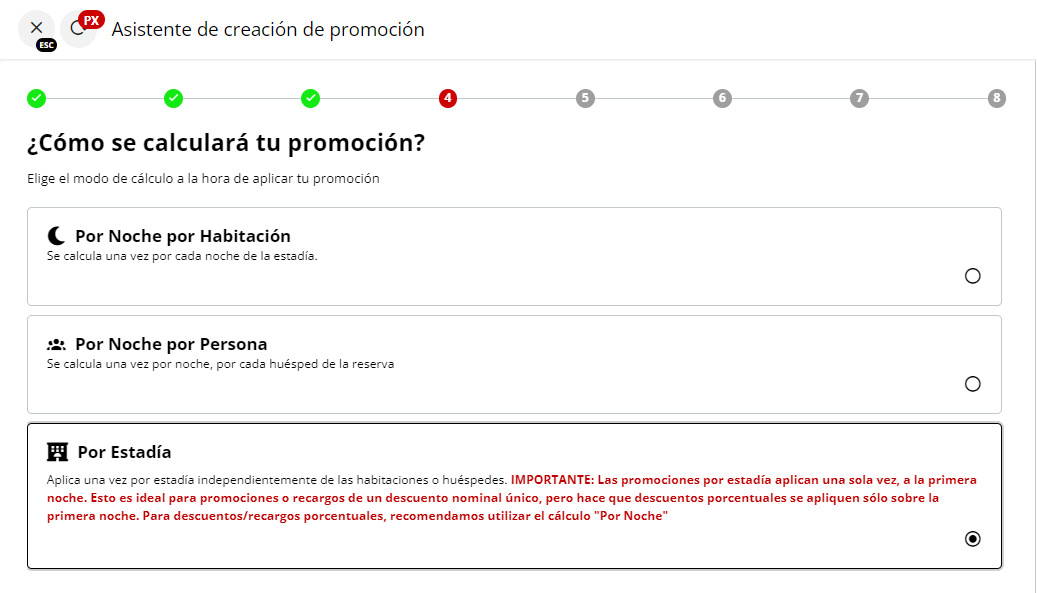 Si seleccionaste “Por estadía” en el paso anterior, ten en cuenta que este recargo se aplicará solo una vez, la primera noche. Es ideal para montos fijos únicos. Para recargos porcentuales, se recomienda calcular “Por Noche”.
