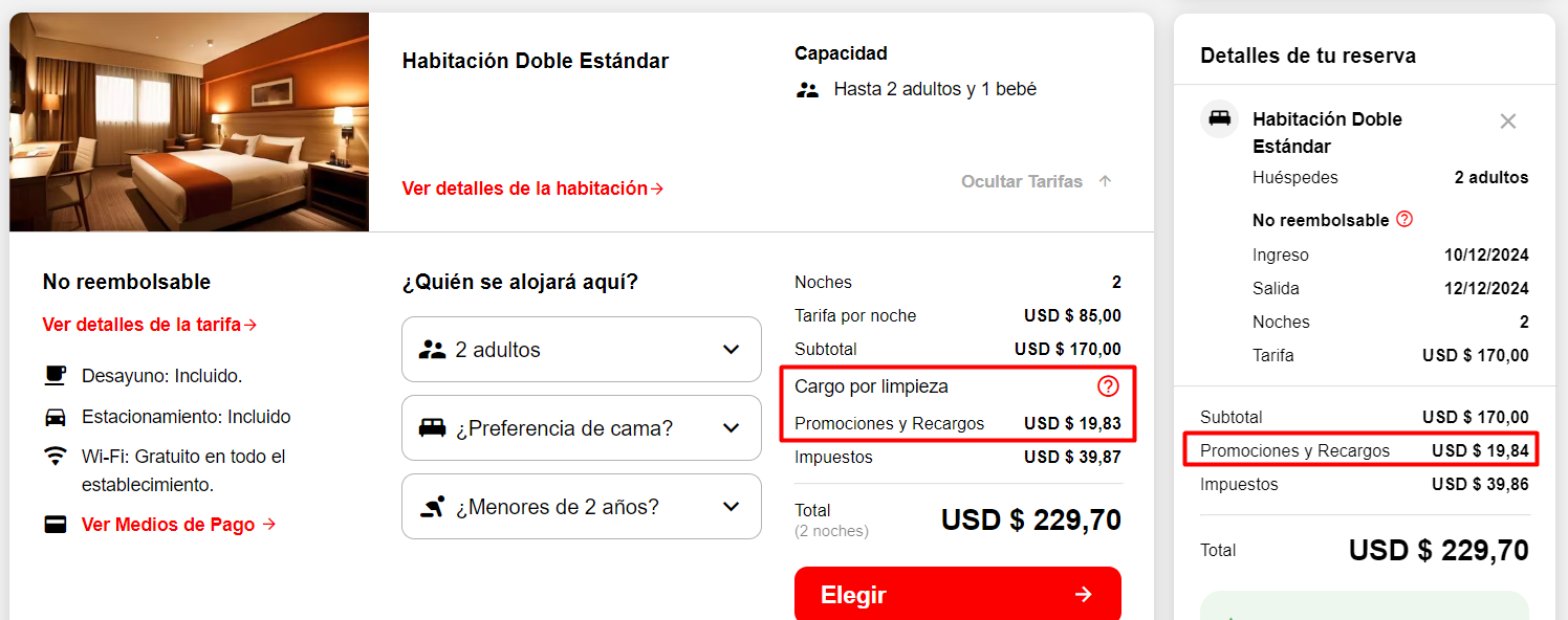 El recargo fijo se visualizará en el motor de reservas de la siguiente manera: Captura de pantalla mostrando cómo se visualiza el recargo fijo en el motor de reservas