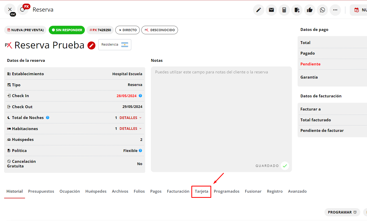 En esta guía explicaremos cómo guardar datos de una nueva tarjeta dentro de una reserva.Pasos para guardar datos de tarjeta