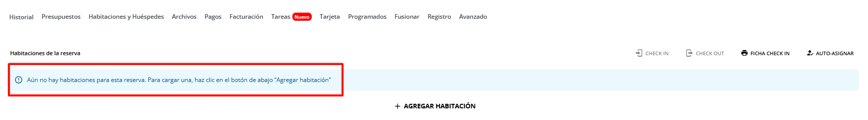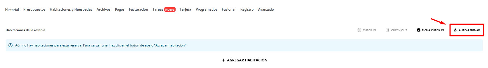 Si la reserva ya cuenta con un presupuesto establecido, puedes seleccionar la opción AUTO-ASIGNAR. Esto creará y asignará automáticamente la habitación a una habitación física disponible.