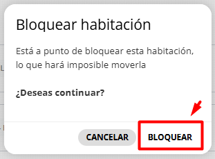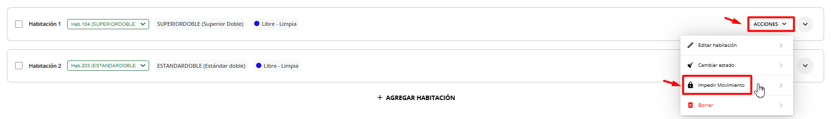 En la sección de la habitación, haz clic en “Acciones” y selecciona la opción “Impedir movimiento” para restringir cualquier cambio de habitación física.