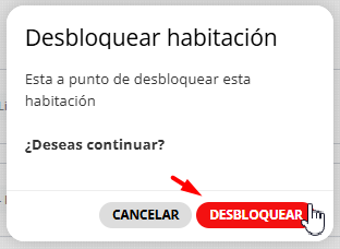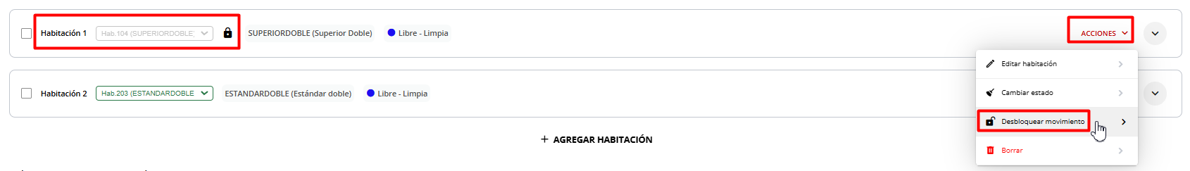 Para llevar a cabo el desbloqueo, en la sección de la habitación, haz clic en “Acciones”, selecciona la opción “Desbloquear movimiento”.