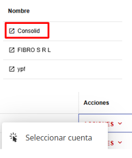 Selecciona la cuenta sobre la que deseas realizar la modificación haciendo clic en el Nombre de la cuenta o en Acciones - Seleccionar Cuenta.