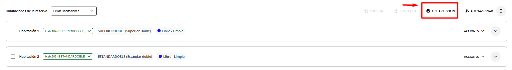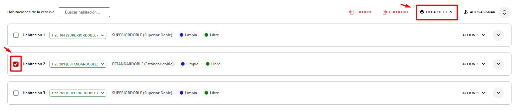 Es posible imprimir la ficha de check-in para todas las habitaciones confirmadas en la reserva. Si deseas imprimir únicamente algunas habitaciones, puedes seleccionarlas individualmente utilizando el casillero ubicado a la izquierda de cada habitación y, a continuación, hacer clic en “FICHA CHECK-IN”.