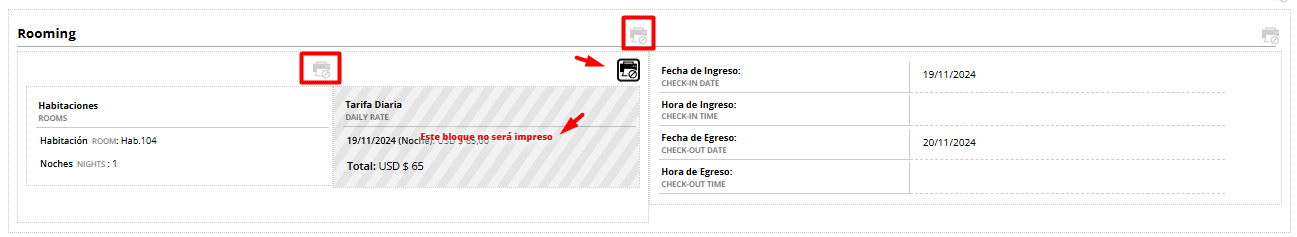 Es posible ocultar información que no deseamos que aparezca en la impresión de la ficha de registro utilizando el botón “Ocultar”. Esta opción resulta útil, por ejemplo, cuando la reserva ha sido gestionada por una agencia de viajes y no se desea que el huésped visualice la tarifa.