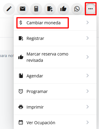En la parte superior derecha de la vista de la reserva, busca y haz clic en el ícono de los tres puntos. Luego, selecciona la opción “cambiar moneda”.
