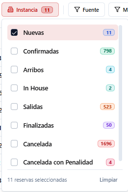 Aplica un filtro para ver solo las reservas en estado ‘Nuevas’. Presiona el botón de filtro ‘Instancia’ y selecciona ‘Nuevas’ en el menú desplegable.