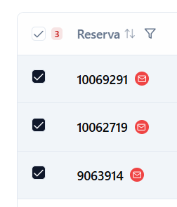 Marca las casillas de verificación (checkbox) junto a las reservas ‘Nuevas’ que deseas cambiar a ‘Confirmadas’. Selecciona una o varias reservas. Al menos una reserva debe ser seleccionada para activar la barra de acciones.