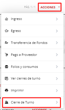 Selecciona el botón Acciones - Cierre de Turno, ubicado en la esquina superior derecha dentro de la vista de Caja Diaria.