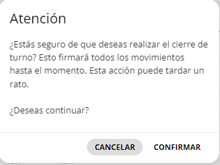 Aparecerá una ventana emergente para confirmar la acción de cierre de turno. Haz clic en CONFIRMAR para proceder.