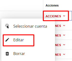 Ubica la Cuenta Recaudadora específica que deseas configurar y haz clic en Acciones > Editar.