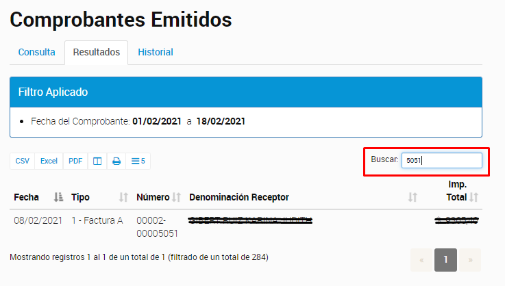 Para encontrar un comprobante específico de manera rápida, puedes ingresar su número en el campo del buscador.