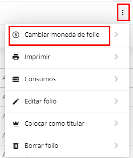En el folio que deseas modificar, haz clic en el ícono de los tres puntos (acciones) y elige la opción “Cambiar moneda de folio”.