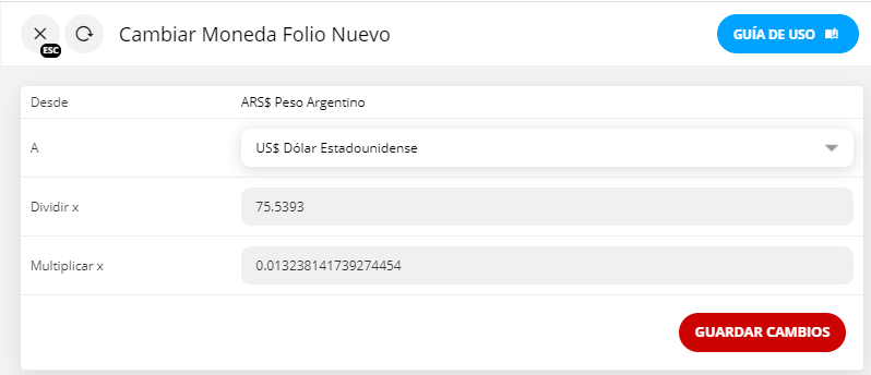 Se abrirá una ventana para que selecciones la moneda a la que deseas convertir. El sistema mostrará los valores de conversión predeterminados (asegúrate de tener configuradas las distintas monedas y tipos de cambio).