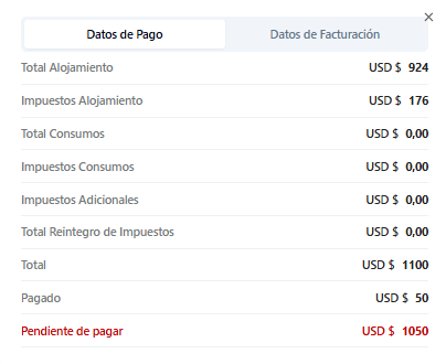 - Total: Suma del valor del alojamiento y todos los consumos adicionales de la reserva.