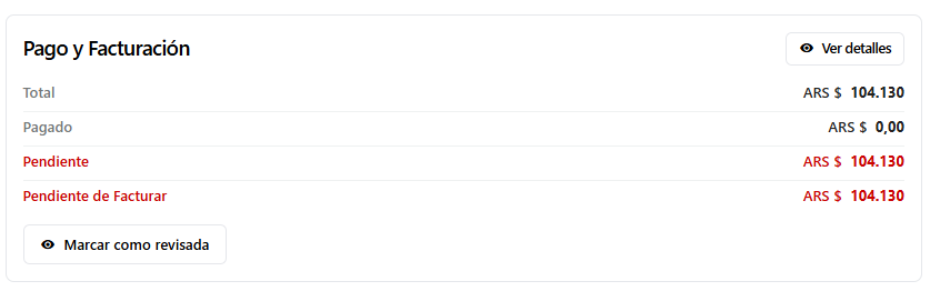 - Pendiente de Facturar: Monto que queda por facturar, calculado entre el total de la reserva y el monto facturado (suma de comprobantes en la pestaña Facturación).