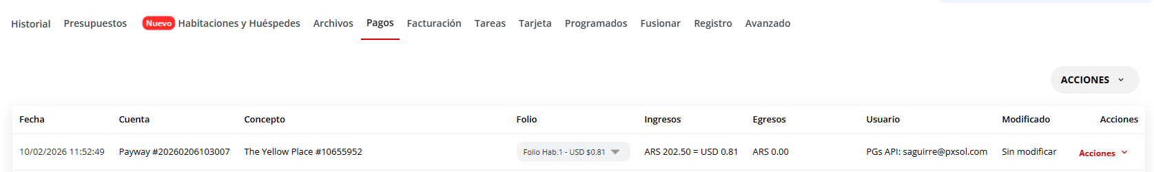 Una vez que el cobro es exitoso, el pago quedará registrado en la pestaña “Pagos” de la reserva. En esta sección podrás visualizar la fecha, el procesador utilizado, el concepto, el folio afectado, el monto del ingreso y el usuario que realizó la operación. Adicionalmente, en la pestaña “Habitaciones y Huéspedes”, los folios se mostrarán fusionados y el saldo actualizado reflejará el pago recibido.