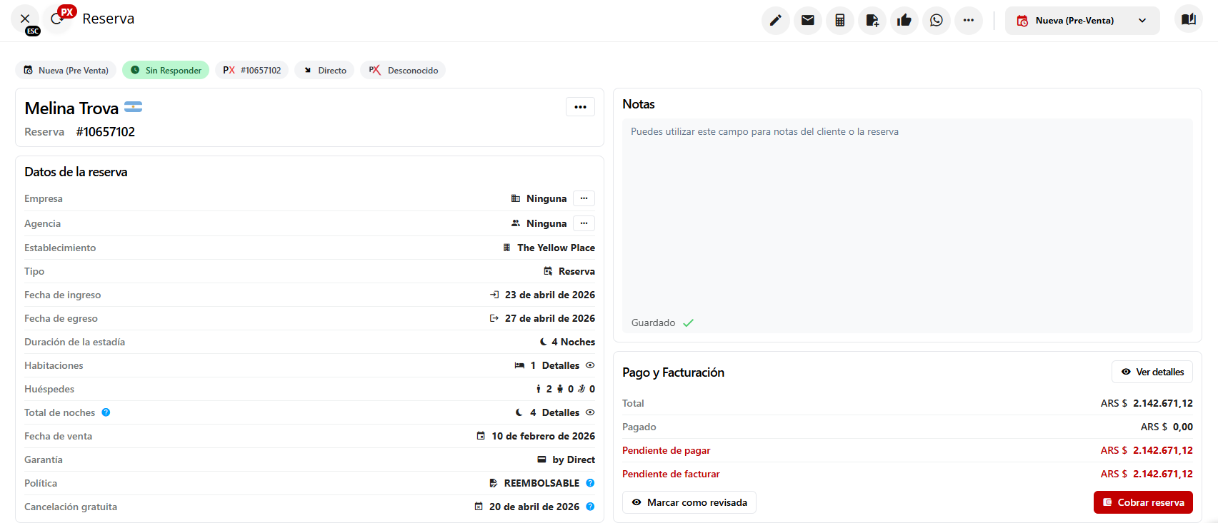 Ingresa a la reserva específica sobre la cual deseas realizar el cobro. La selección puede realizarse desde el panel principal o a través del buscador general del sistema.