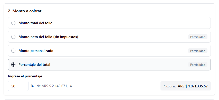 - Monto total del folio: Cobra el saldo completo de los folios seleccionados.