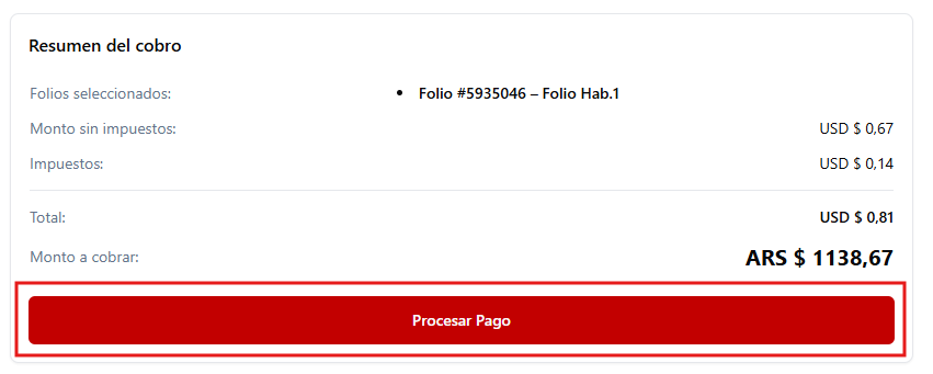 Revisa el “Resumen del cobro” en la parte inferior de la ventana, que detalla los folios seleccionados, el monto sin impuestos, los impuestos, el total y el monto final a cobrar. Una vez verificada toda la información, haz clic en el botón “Procesar Pago” para ejecutar la transacción.