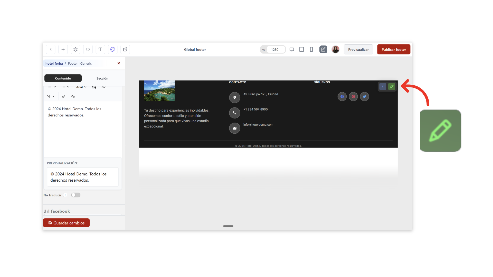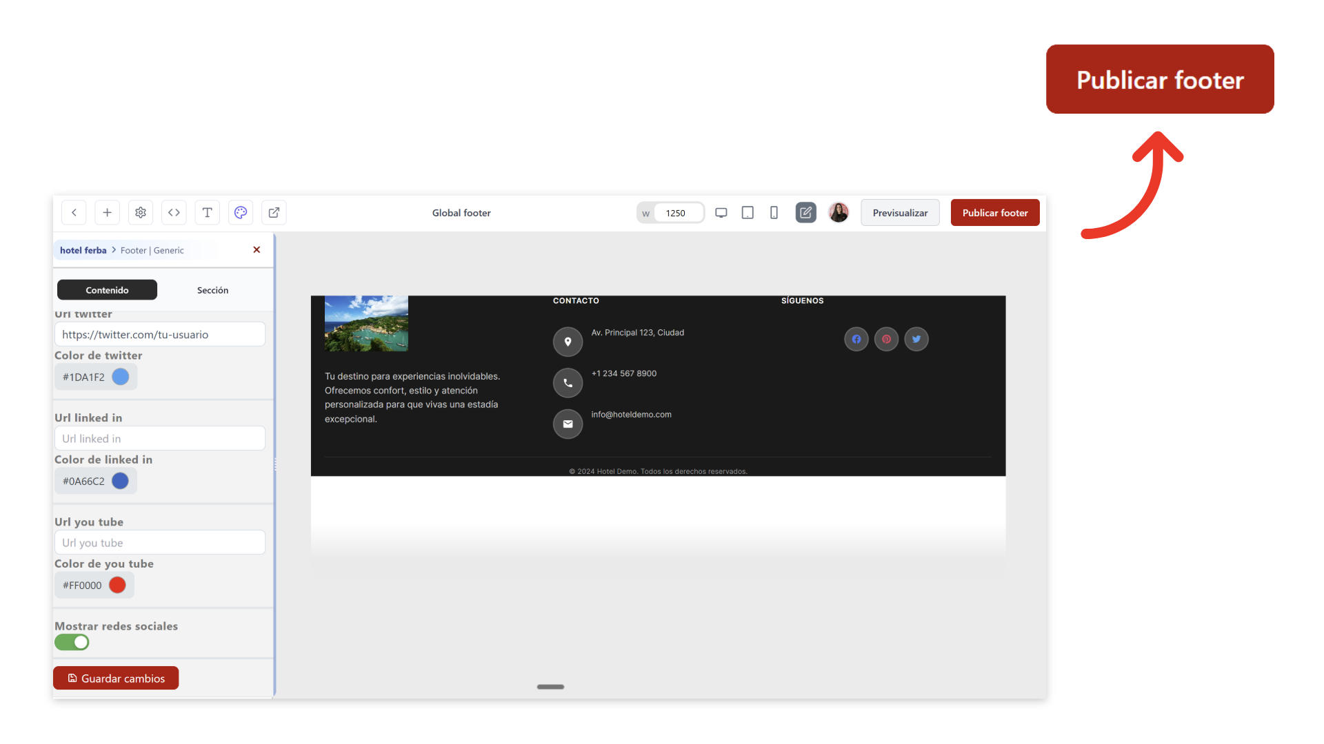 En esta guía aprenderás a configurar el módulo de pie de página (Footer) usando el editor web. Esta funcionalidad te permite:- Agregar un pie de página estandarizado a tu sitio web.