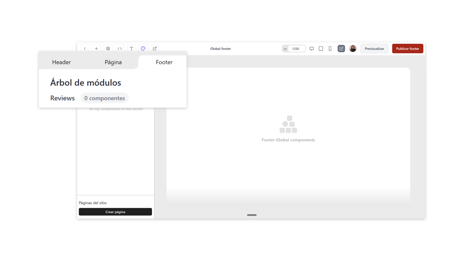 Dentro del editor web de una de tus páginas, dirígete a la pestaña Footer, ubicada en el panel superior izquierdo.