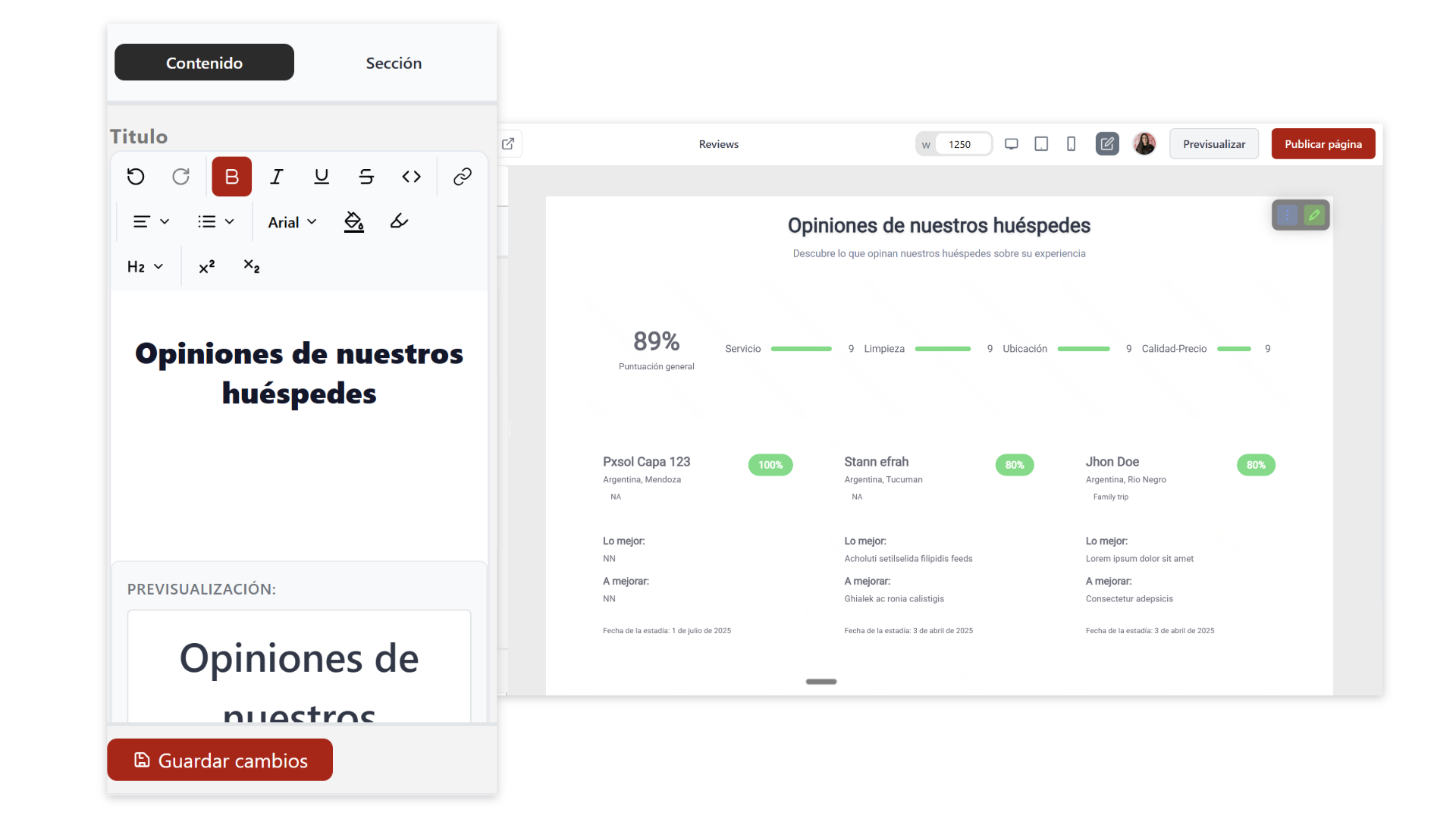 - Título de sección: Define un título como “Lo que dicen nuestros huéspedes”.