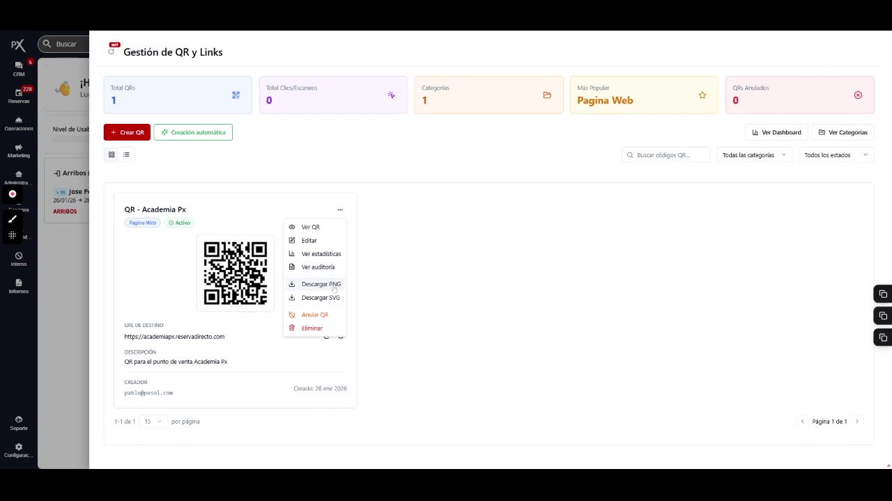 Desde el menú de acciones, puedes descargar la imagen del código QR en diferentes formatos para su uso:
